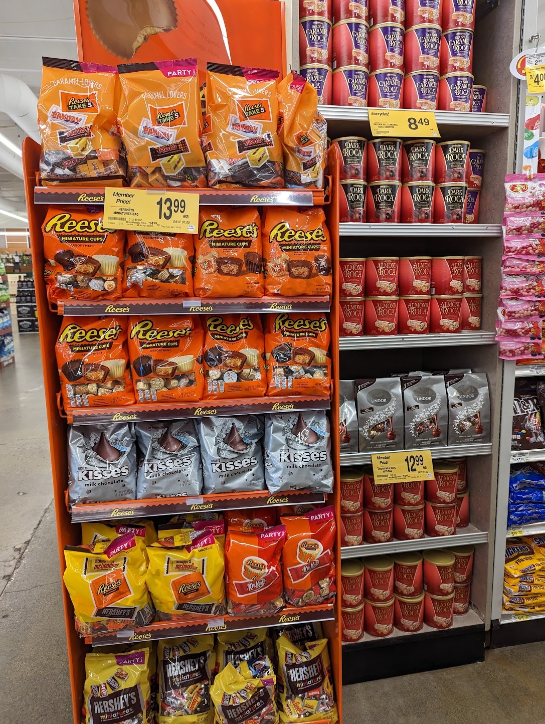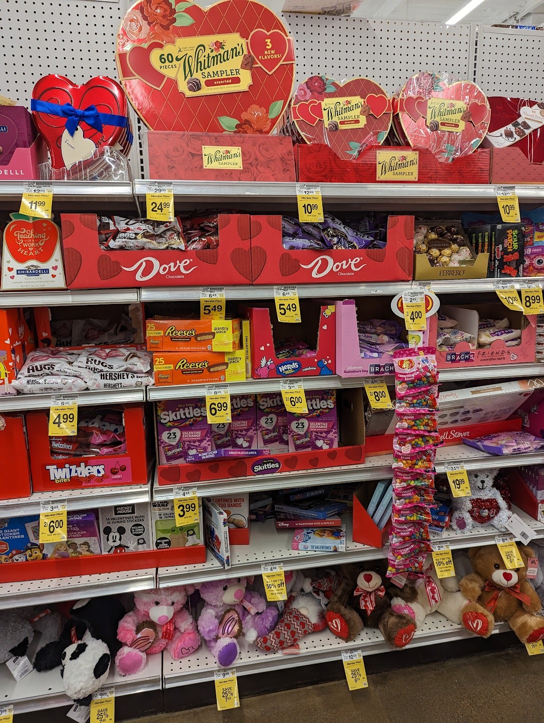 여긴 발렌타인 데이 한정 초콜렛은 별로 없네요. 발렌타인 포장을 해버리면 14일 이후에는 재고 처리 대상이 되어버리니까요. 밑에서 두번째 선반에 있는 마운즈(Mounds)라는 초콜렛은 바운티(Bounty)로도 알려져있는데요, 안에 코코넛 맛 필링이 듬뿍 들어가 있어요. 코코넛 좋아하시면 강력 추천입니다.